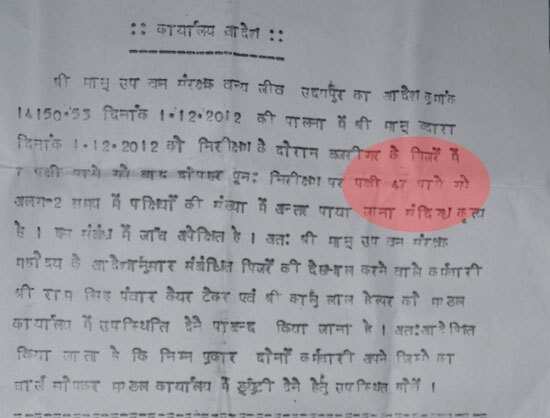 Office Order on Missing Birds The office order copy is saying that there were 7 birds seen in the morning of 01.01.12 and in the afternoon there were 47 birds leaving a big question mark on the face of the forest officials.