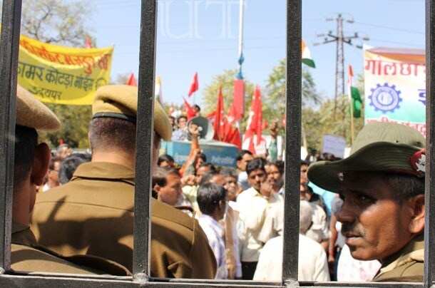 A large number of activists from various labor unions have gathered outside the Bank Tiraha near Bapu Bazar at around 11 in the morning and proceeded in a form of a rally which concluded in front of Collector’s office. The representatives of INTUC, Bank workers Union and many organizations supported the rally and handed over the letter of demands to the administration.