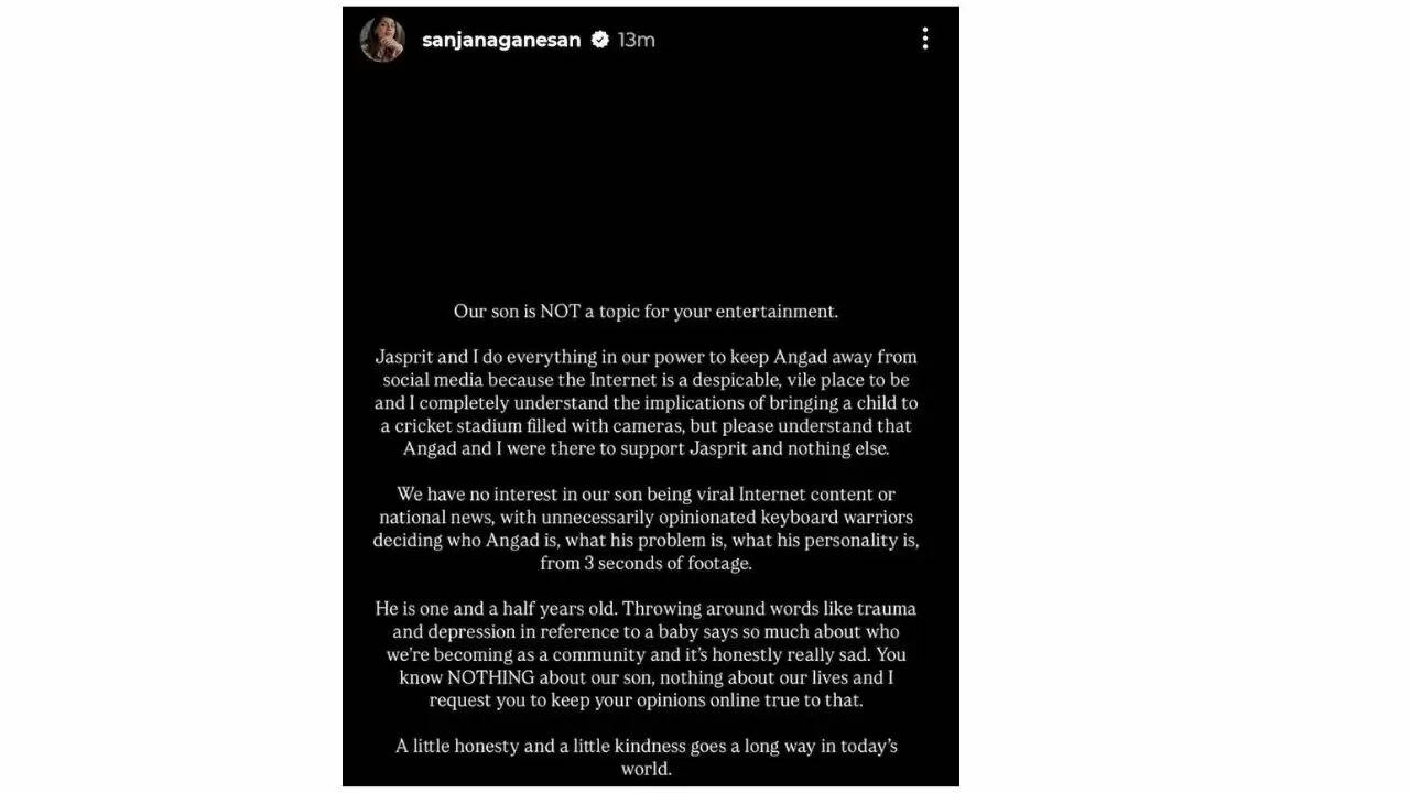 Sanjana and Jasprit Bumrah both shared the same photo on their Instagram. Sanjana's post reads, "Our son is not a subject of your entertainment. Jasprit and I try our best to keep Angad away from social media because the internet is a hateful place. I completely understand what can happen when bringing a child to a stadium full of cameras, but please understand that Angad and I went there to support Jasprit."