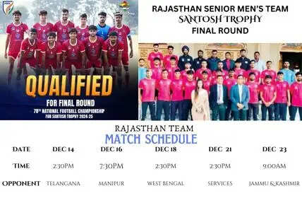 The teams first match in the final round consisting of 12 top teams of the country, will be against hosts Telangana on December 14. Team Rajasthan will be competing against Bengal, who are 32 time winners of Santosh Trophy, apart from strong teams, viz. last years winners and 7 time champion Services, Manipur, Telangana, Jammu & Kashmir in its group. The schedule for Rajasthan is: